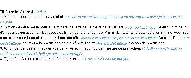 Signification issue du dico de l’Académie Française, parue en 1932.Merci à Arnaude et Inès pour la numérisation du mot abattage.