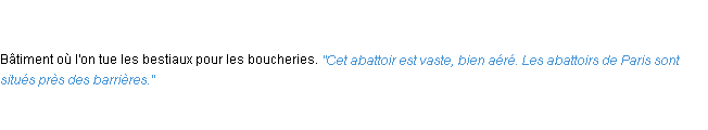 Signification éditée en 2010 par l’équipe de la-definition.fr.Merci à Benoite et Bastien pour la numérisation du mot abattoir.