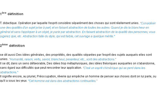 Ancienne signification parue en 1798 dans dictionnaire de l’Académie Française.Merci à Colombe et Aude pour la numérisation du mot abstraction.