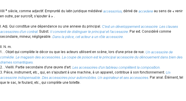 Ancienne définition académique pour le terme « accessoire » (parue en 1798).Merci à édith et Florette pour la numérisation du mot accessoire.