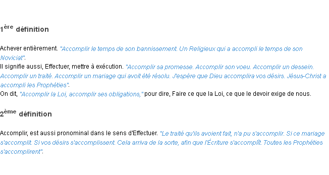 Ancienne signification éditée par l’Académie Française, année 1798.Merci à Jean-marie et Sacha pour la numérisation du mot accomplir.