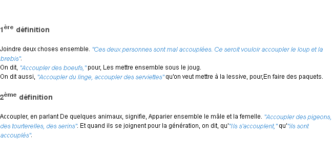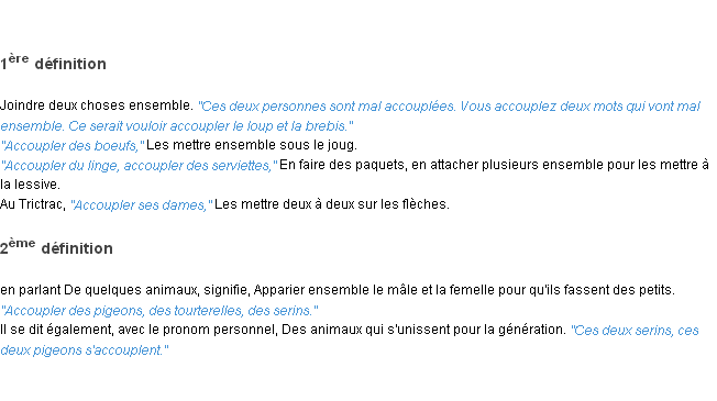 Ancienne signification éditée en 1835 pour le terme « accoupler » par l’Académie Française.