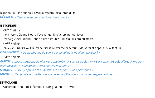 Signification du terme « accroupir », parution de 1876 (dictionnaire le Littré).Merci à Gérard et Serge pour la numérisation du mot accroupir.