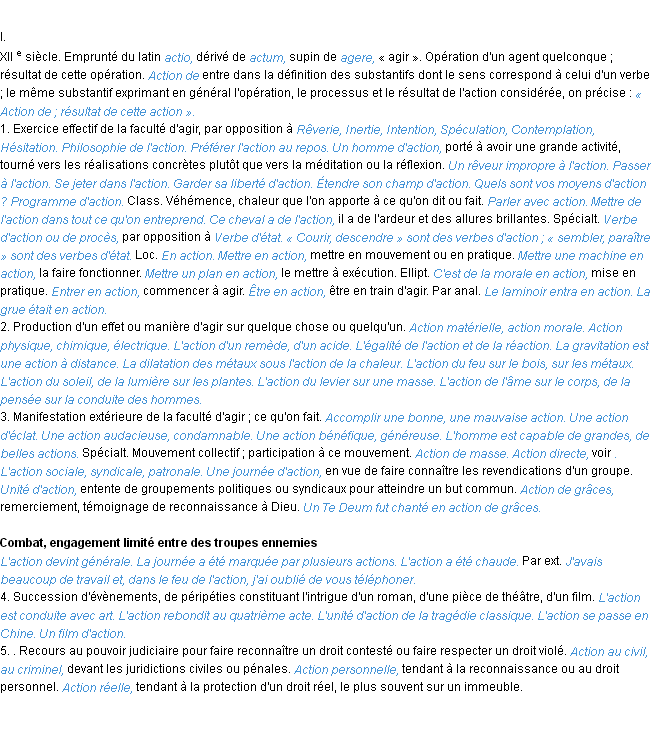 Ancienne signification issue du dico de l’Académie Française, parue en 1798.Merci à Françoise et Emeline pour la numérisation du mot action.