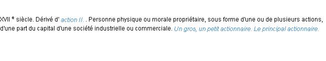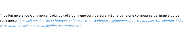Ancienne signification du terme « actionnaire », parution de 1798, dictionnaire académique Français.Merci à Jacques et Arnaud pour la numérisation du mot actionnaire.