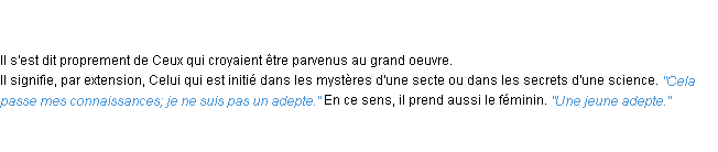 Ancienne définition de l’Académie Française (édition de 1798) pour le mot « adepte ».Merci à Fabien et Sandrine pour la numérisation du mot adepte.
