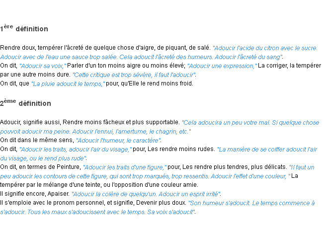 Ancienne définition « adoucir » du dictionnaire académique Français, parution de l’année 1798.Merci à Claudine et Baudouin pour la numérisation du mot adoucir.