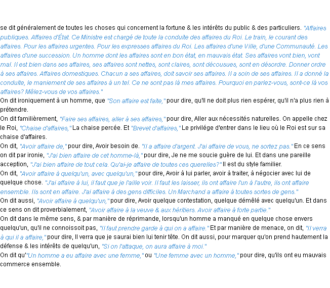Ancienne signification du terme « affaires », parution de 1798, dictionnaire académique Français.