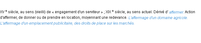 Signification éditée en 1876 pour le terme « affermage » par Emile Littré.Merci à Théodore et Fernande pour la numérisation du mot affermage.