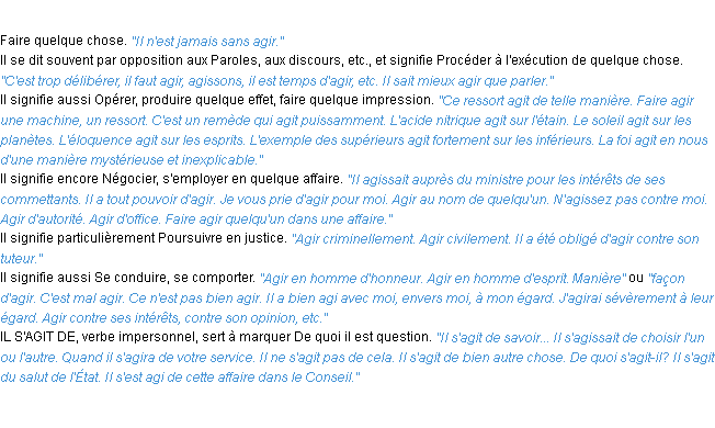 Signification du terme « agir », parution de 1932, dictionnaire académique Français.
