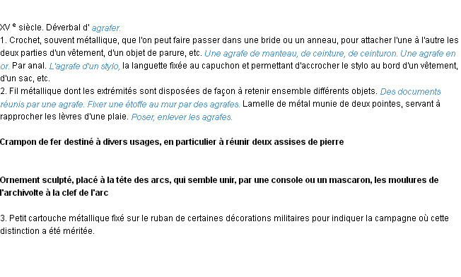 Ancienne signification du terme « agrafe », parution de 1835, dictionnaire académique Français.