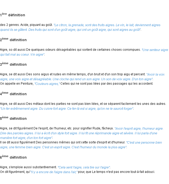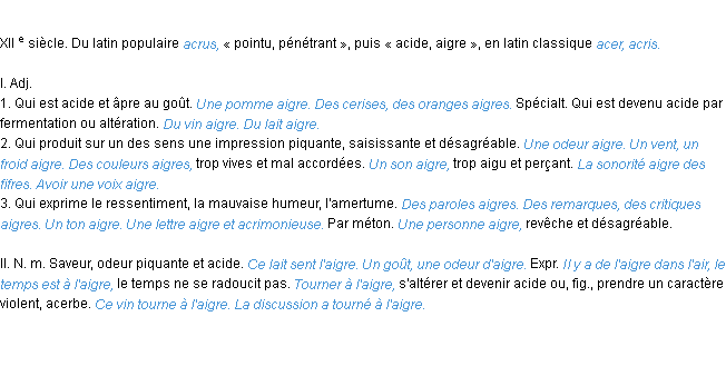 Signification du terme « aigre », parution de 1986, dictionnaire académique Français.