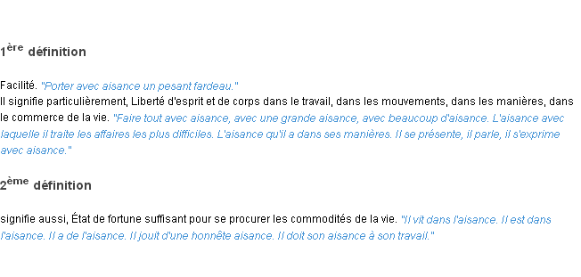 Ancienne signification développée en 1798 par l’académie Française (ACAD - 1798).Merci à Patrice et Fabien pour la numérisation du mot aisance.