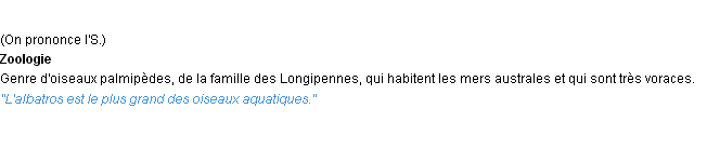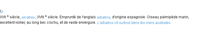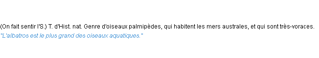 Définition du mot « albatros » par l’équipe de la-definition.fr (édition de 2011).Merci à Océane et Arianne pour la numérisation du mot albatros.