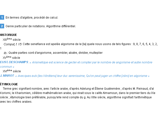 Ancienne signification parue en 17962 dans dictionnaire de l’Académie Française.Merci à Theirn et Baptiste pour la numérisation du mot algorithme.