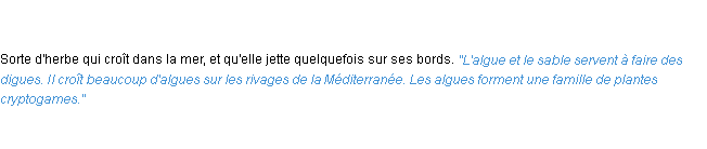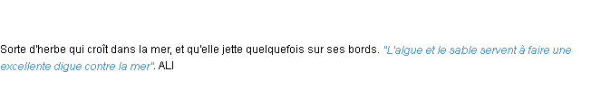 Ancienne signification éditée en 1798 pour le terme « algue » par l’Académie Française.Merci à Berthe et Yves pour la numérisation du mot algue.