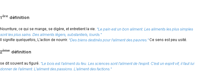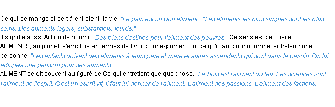 Ancienne signification parue en 1798 dans dictionnaire de l’Académie Française.Merci à Florentin et éloise pour la numérisation du mot aliment.