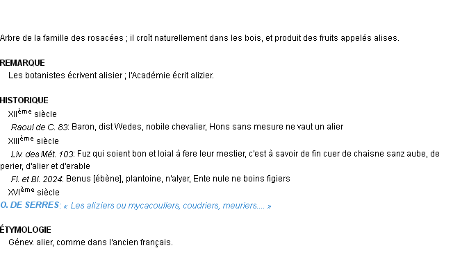Signification du terme « alisier », parution de 1932, dictionnaire académique Français.
