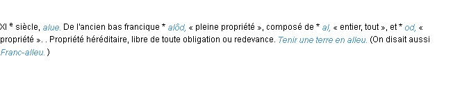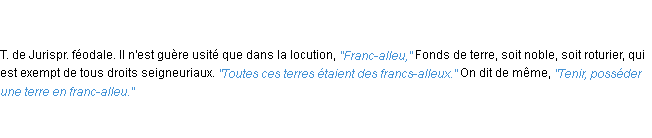 Ancienne définition de « alleu » de source académique (Académie Française, parution de 1798).Merci à Gustave et Noel pour la numérisation du mot alleu.