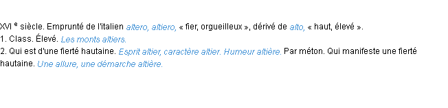 Ancienne signification développée en 1798 par l’académie Française (ACAD - 1798).Merci à Olivie et Sylvie pour la numérisation du mot altier.