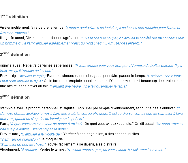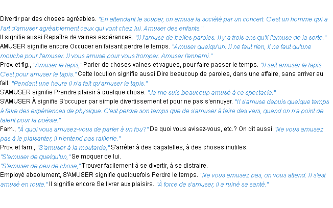 Ancienne définition du mot « amuser » par l’Académie Française (édition de 1798).Merci à Germain et Margot pour la numérisation du mot amuser.