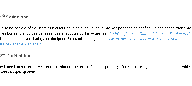 Signification du terme « ana », parution de 1876 (dictionnaire le Littré).Merci à Odile et Jolie pour la numérisation du mot ana.