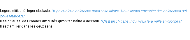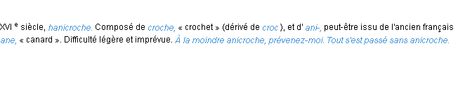 Ancienne définition « anicroche » du dictionnaire académique Français, parution de l’année 1798.Merci à Suzette et Gilberte pour la numérisation du mot anicroche.