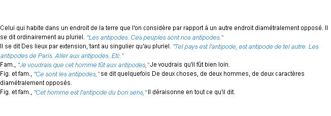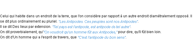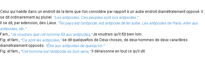 Ancienne signification développée en 1798 par l’académie Française (ACAD - 1798).Merci à Jacques et Apolline pour la numérisation du mot antipode.