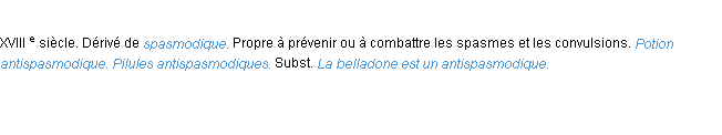 Définition du mot « antispasmodique » par Emile Littré (édition de 1876).Merci à Claudette et Manon pour la numérisation du mot antispasmodique.