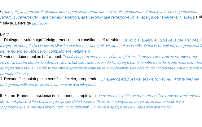 Définition académique pour le terme « apercevoir » (parue en 1986).