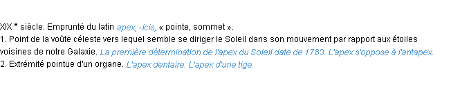 Définition d’Emile Littré (édition de 1876) pour le mot « apex ».Merci à Doriane et Bastien pour la numérisation du mot apex.