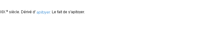 Définition du mot « apitoiement » par Emile Littré (édition de 1876).Merci à Béatrice et Madeline pour la numérisation du mot apitoiement.