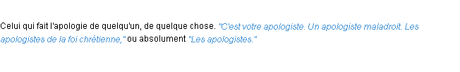 Ancienne signification développée en 1798 par l’académie Française (ACAD - 1798).Merci à Désirée et Lucie pour la numérisation du mot apologiste.