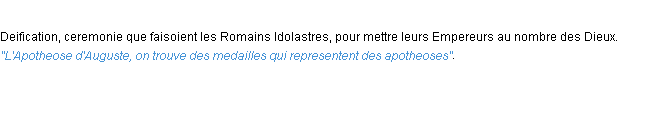 Ancienne signification issue du dico de l’Académie Française, parue en 1694.Merci à Arianne et Philibert pour la numérisation du mot apotheose.