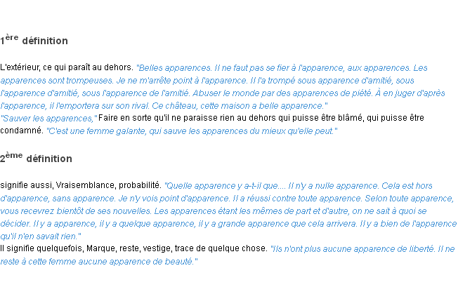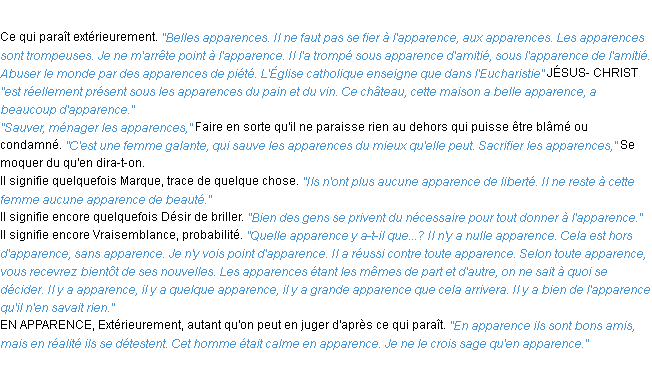 Ancienne définition de l’Académie Française (édition de 1835) pour le mot « apparence ».