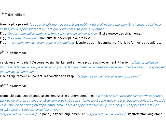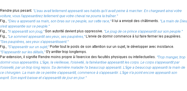 Ancienne signification développée en 1798 par l’académie Française (ACAD - 1798).Merci à Valérie et Céleste pour la numérisation du mot appesantir.