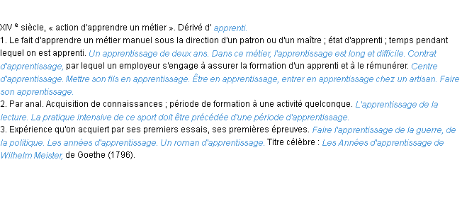 Ancienne signification éditée en 1835 pour le terme « apprentissage » par l’Académie Française.