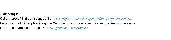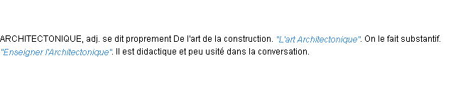 Ancienne signification développée en 1798 par l’académie Française (ACAD - 1798).Merci à Adélaïde et Marc pour la numérisation du mot architectonique.