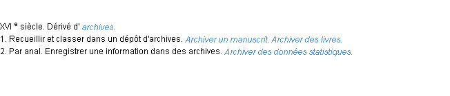 Définition développée dans dictionnaire académique, 1986.Merci à Perrine et Clementine pour la numérisation du mot archiver.