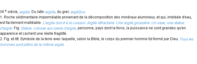 Ancienne signification parue en 1798 dans dictionnaire de l’Académie Française.Merci à Paule et Noella pour la numérisation du mot argile.