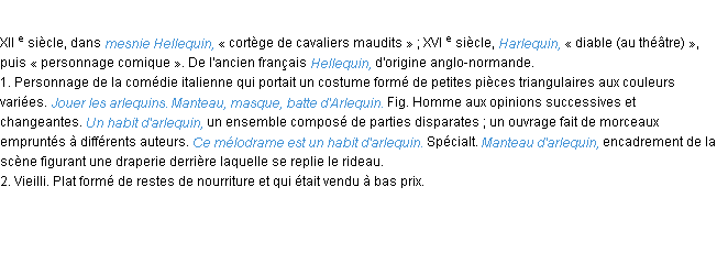 Signification éditée par l’Académie Française, année 1986.Merci à élise et Martine pour la numérisation du mot arlequin.