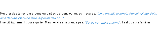Ancienne définition académique pour le terme « arpenter » (parue en 1798).Merci à Placide et Gérald pour la numérisation du mot arpenter.