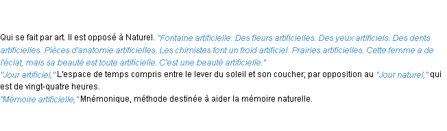 Ancienne signification éditée en 1835 pour le terme « artificiel » par l’Académie Française.