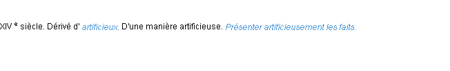 Définition académique pour le terme « artificieusement » (parue en 1986).