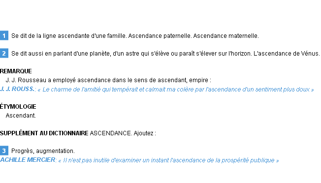 Définition de « ascendance » issue du Littré (Auteur Emile Littré, édité en 1876).Merci à Gautier et Marguerite pour la numérisation du mot ascendance.