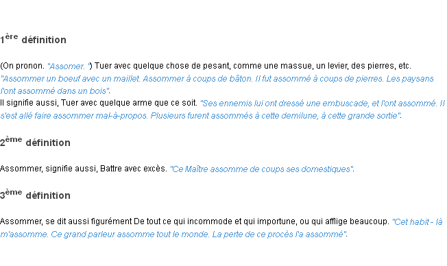 Ancienne signification du terme « assommer », parution de 1798, dictionnaire académique Français.Merci à Dorothée et Serge pour la numérisation du mot assommer.