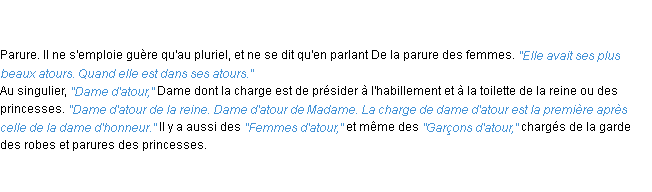 Signification du terme « atour », parution de 1986, dictionnaire académique Français.