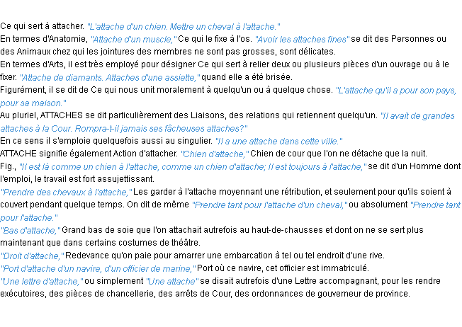 Ancienne définition académique pour le terme « attache » (parue en 1835).