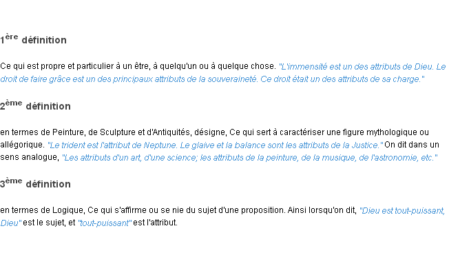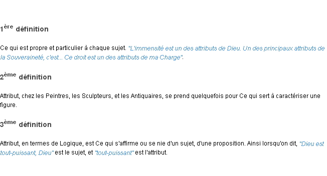 Ancienne signification éditée en 1835 pour le terme « attribut » par l’Académie Française.