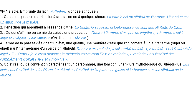 Signification du terme « attribut », parution de 1986, dictionnaire académique Français.